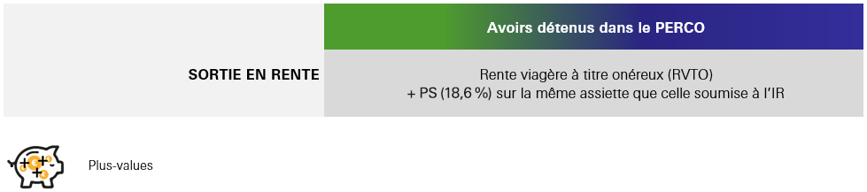A la sortie du PERCO, seules les plus-values réalisées sur les sommes investies sont fiscalisées. Elles sont soumises aux prélèvements sociaux en vigueur (18,6 %). Si vous choisissez de sortir en rente, celle-ci sera fiscalisée selon le régime favorable des rentes acquises à titre onéreux.